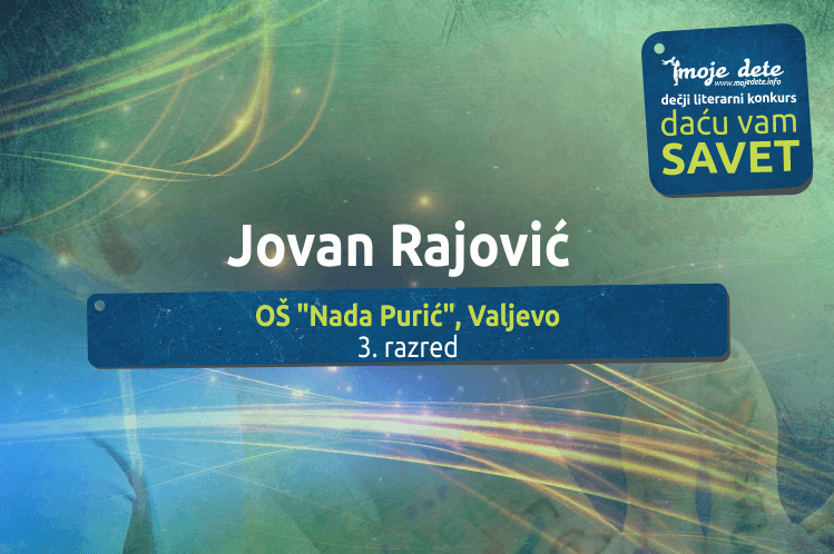 Pesmom pod nazivom “Budite kao deca” Jovan Rajović učenik osnovne škole “Nada Purić” iz Valjeva osvojio je 1. mesto na našem konkursu pod nazivom “Daću vam svet”. Ovaj rad je osvojio 1. mesto u kategoriji mlađih osnovaca. Jovan piše pesme od predškolskog i uživa u pisanju. Nedavno smo posetili ovog talentovanog dečaka, a kako je to izledalo možete pogledati OVDE.