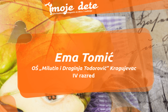 Ema Tomić je učenica 4. razreda Osnovne škole „Milutin i Draginja Todorović“ iz Kragujevca. Ema nam je poslala pesmu „Miris dunje na ormaru“ u okviru literarnog konkursa koji je raspisao sajt MojeDete. Uživajte!