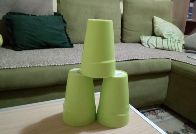 Uzima se komplet od 9 ili 12 plastičnih čaša, koje treba složiti jednu u drugu i tako složene postaviti na sto (sa otvorima okrenutim na dole). Na dnu svake čaše treba probušiti rupice, da ne bi dolazilo do stvaranja vakuma između njih koji bi usporavao uzimanje sa gomile, odnosno kako čaša koja se uzima ne bi za sobom povlačila i ostale.